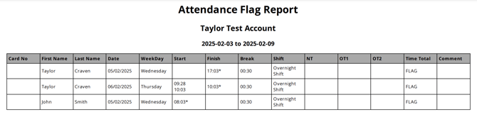 - Review your Flag Report then update those employees' attendance records. The below example shows us the following flags: